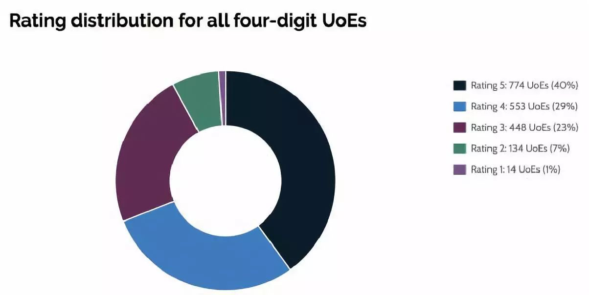 在2018年评估的677个两位数评估单元(UoEs)中,164个获得了5分(远高于世界标准),219个获得了4分(高于世界标准)。这总共有383个两位数的uos的等级高于或远远高于世界标准。