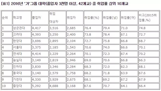 分析结果,毕业生超过3000人的大学中成均馆大学的就业率以76.4%居最高位,其次是高丽大学(73.8%),汉阳大(72.7%),首尔大(70.6%),延世大(70.1%),崇实大(69%),仁荷大(68.3%),东国大(68.2%),嘉泉大(68.1%),中央大(67.7%)