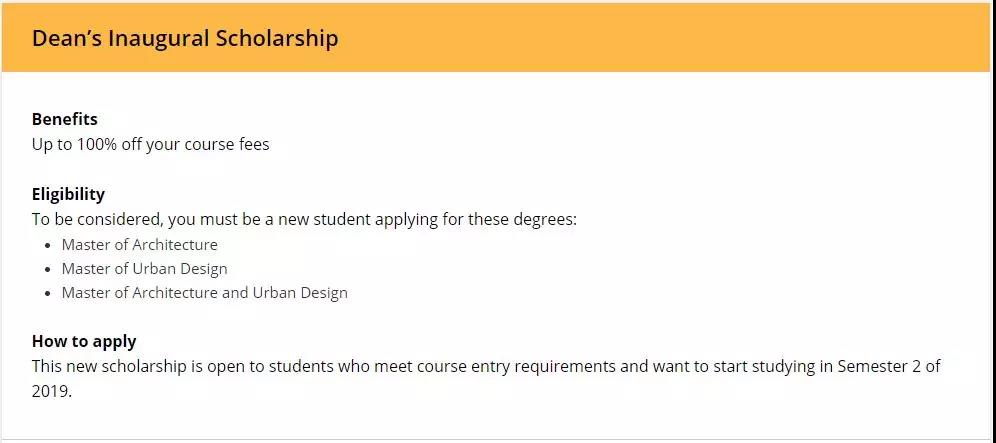 专属奖学金 院长任职奖学金 (Dean's Inaugural Scholarships): 金额:最高可达 100%学费全免