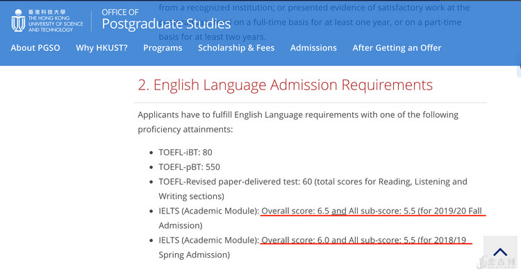香港科技大学全部授课型专业的语言要求从之前的雅思6小分5.5,提升至雅思6.5小分5.5(2019Fall),成为“港中科”中语言要求最高的学校。 与此同时,托福的要求并未提高,还是80分。 之前有不少背景不错的理工科学生,但是英语基础一般的,只要雅思能考到6分,科大录取的希望是很大的。 但是从19Fall开始,科大全面提升了语言录取的要求,申请难度上升一个档次。
