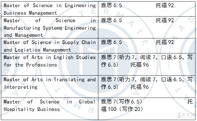 香港城市大学的语言要求也一直比较稳定,授课型硕士的最低申请要求为雅思6.5或托福79,并且大部分专业现在仍接受六级成绩,但是各个专业对于六级成绩要求不同(大部分要求在450-500)。 以下专业语言要求会更高一些: