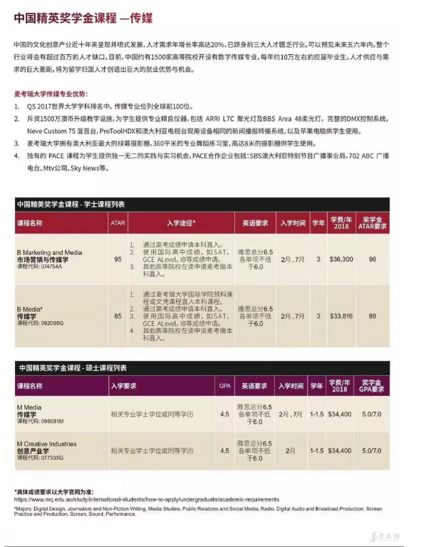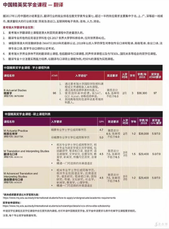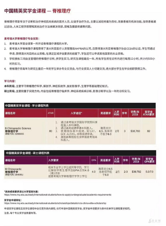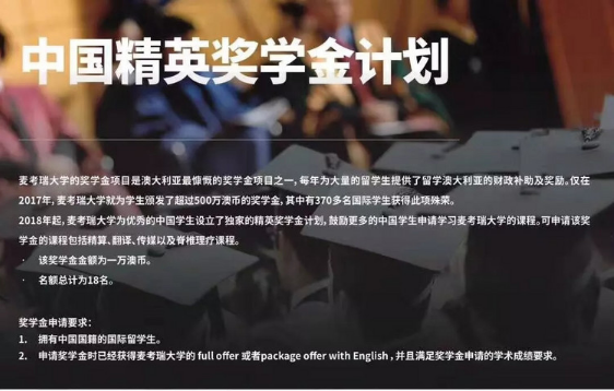 2018年,麦考瑞大学为优秀的中国学生设立了“精英奖学金”,涵盖 精算、翻译、传媒、脊椎理疗 课程,每个价值10000澳币哦,共计18个名额,先到先得!!!