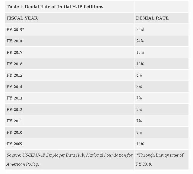 据美国移民局的数据, 在2019年第一季度,H1B的首次拒签率(即要求补件或者直接拒绝)飙升至32%。而在2017年,这一数字仅为13%。