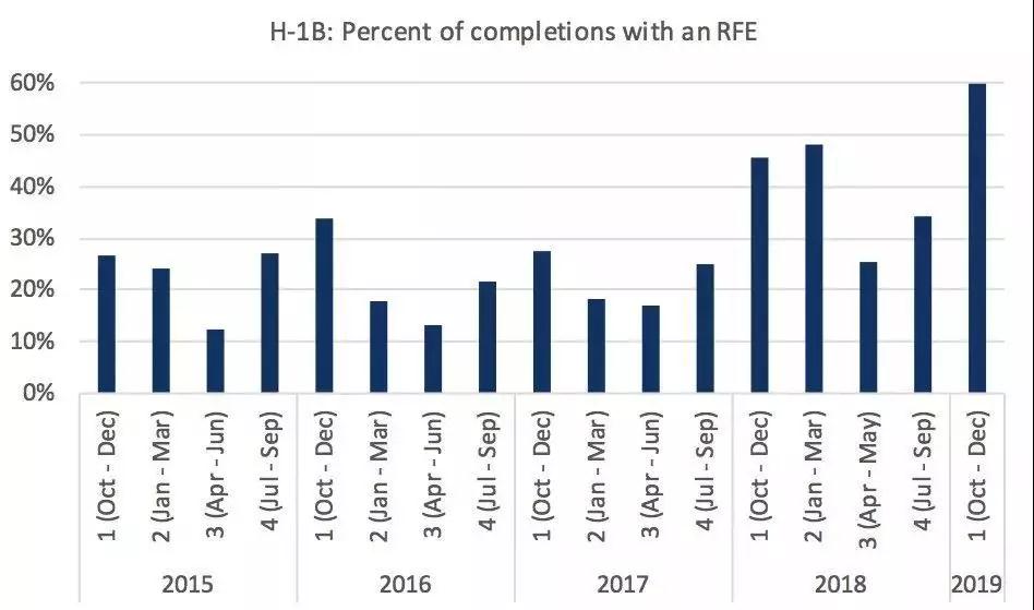 另外,USCIS要求补充说明(RFE, Request for Evience)的比率也在大大增加。据USCIS的数据,在2018年第四季度,将近60%的H1B申请者收到了要求补充RFE的要求,而在2017年,这一数字还不到30%。