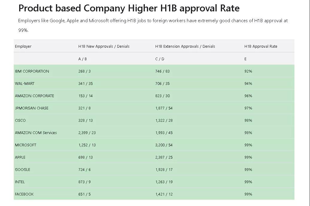 根据USCIS公布的数据,在所有帮雇员提交了H1B申请的雇主中,大型科技类公司最为靠谱。几大科技巨头,例如微软、谷歌、苹果、英特尔、脸书等,2018年第四季度的H1B通过率都在99%以上。其次,亚马逊的通过率也在98%以上。