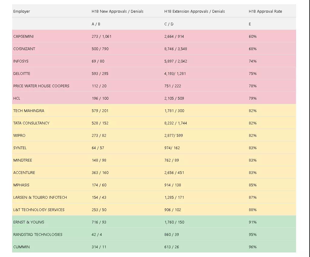 相应的,有一些公司的通过率就比较低了~根据USCIS公布的数据,Capgemini、Cognizant、 Infosys这几家IT服务公司的通过率较低。另外,部分会计师事务所的通过率也相对较低, 普华永道和德勤的通过率都分别只有75%和78%,但有趣的是,安永的通过率很高,达到91%。