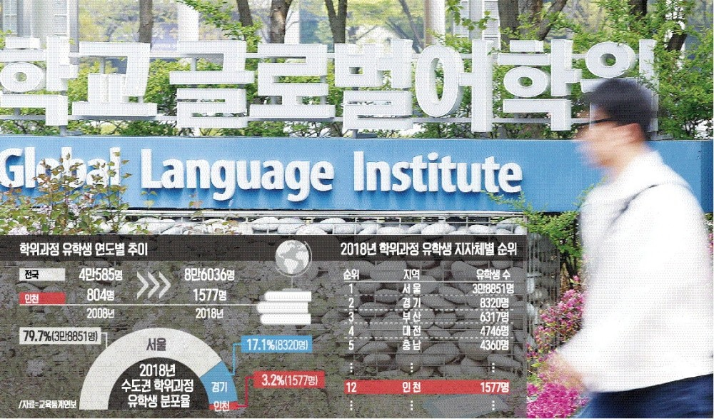 在仁川攻读学历课程(本科/研究生)的留学生数在所有广域市也是最少的,仅比蔚山的留学生多。 在首尔攻读学历课程的留学生多达 3万8851人 ,其中16所大学的留学生数超过仁川地区所有留学生总和。