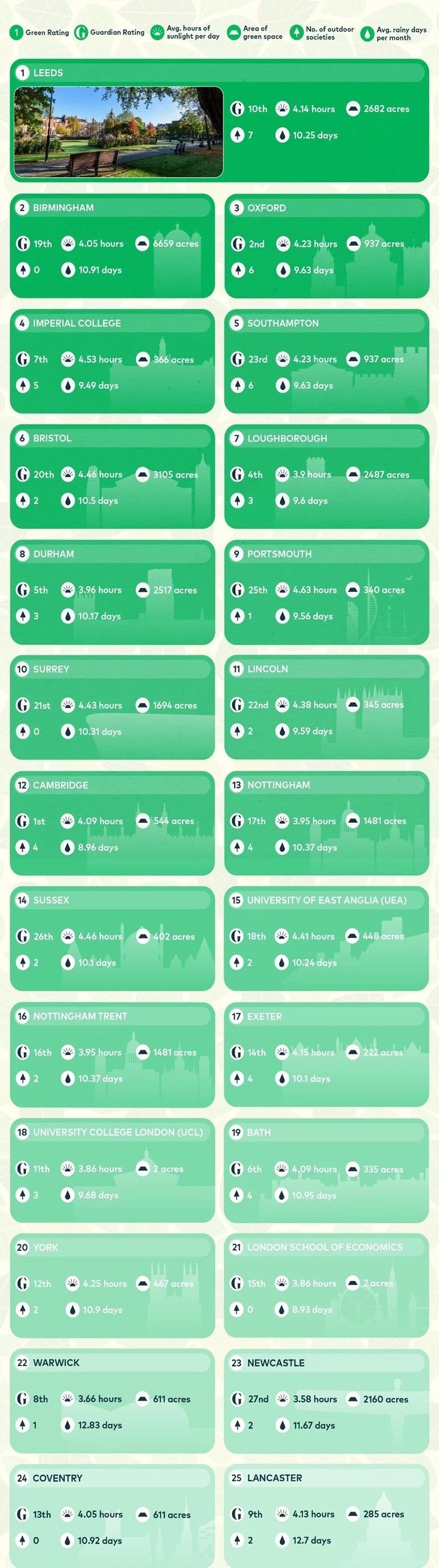 大家都知道英国常下雨,如果是长时间阴雨绵绵,恐怕连做事的心情都没有了,所以选择一个下雨天少些的城市是很重要的。 小曼姐精选了英国最好的25所大学 (根据卫报的大学排名) ,将它们按照以上标准进行了一个排名。