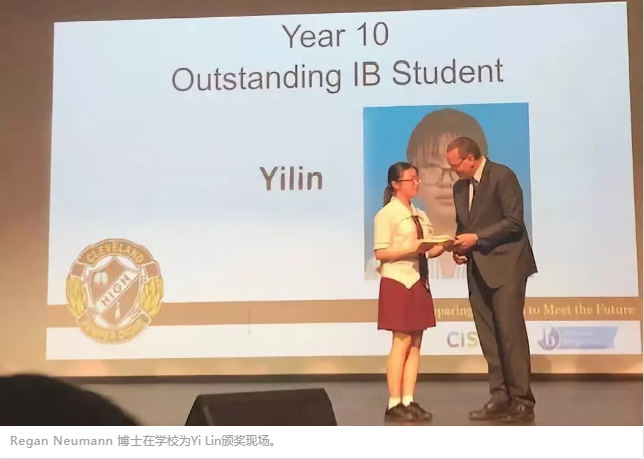 Yilin是Clevelan District州立中学的 学生, 被学校授予IB国际文凭预备课程项目杰出学生的称号, 并 由昆士兰教育部部长助理Regan Neumann 博士亲自为她颁奖。