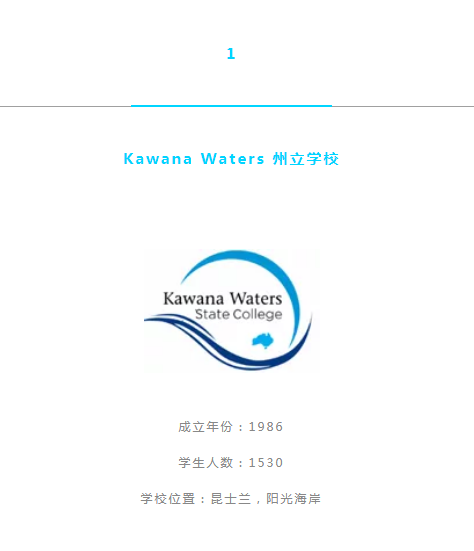 Kawana Waters州立学校是一所包含了 从学前班到12年级 全阶段课程的中学。学校位于阳光海岸市内中心地区,距离布里斯班北部约1个小时车程。