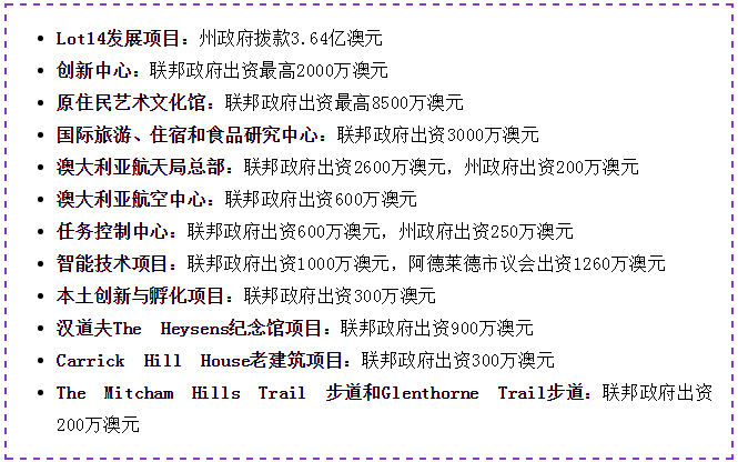 澳大利亚城市部长Alan Tuge表示,该协议将通过诸如Lot 14这样的创新城市改建项目创造成百上千个 就业机会 。“它将重点专注于发展阿德莱德的创新经济,支持该市和整个州的人口增长,并推动阿德莱德文化和旅游经济的蓬勃发展。”那么在“城市协议”中,对阿德莱德的改造项目都有哪些呢? 让我们一起来看看具体的 资金分配 情况:
