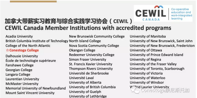 康尼斯托加学院的co-op带薪实习课程被加拿大带薪实习教育与综合实践学习协会(CEWIL)官方认可。目前,加拿大仅有40所院校提供认可的带薪实习课程,其中包括多伦多大学、滑铁卢大学、麦克马斯特大学、阿尔伯塔大学、英属哥伦比亚大学、西蒙菲莎大学等。以下为加拿大带薪实习教育与综合实践学习协会认证院校: