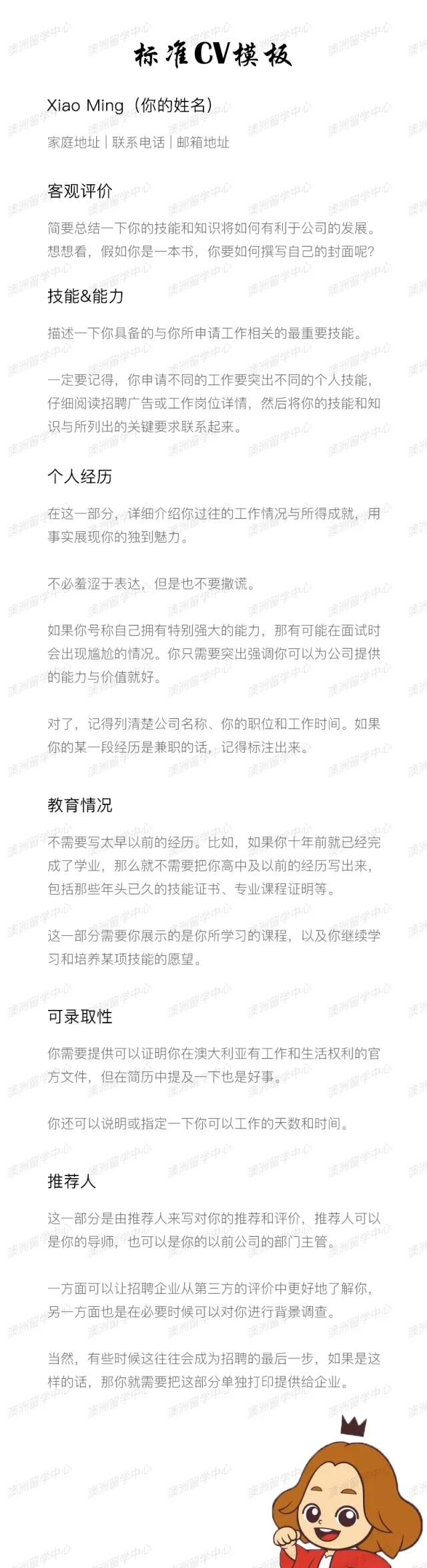 等你真的出了国,作为国际学生,你在澳洲有每周工作 20小时的权利,来赚取零花、充实生活。到时,你免不了又需要写各种各样的CV来申请工作。