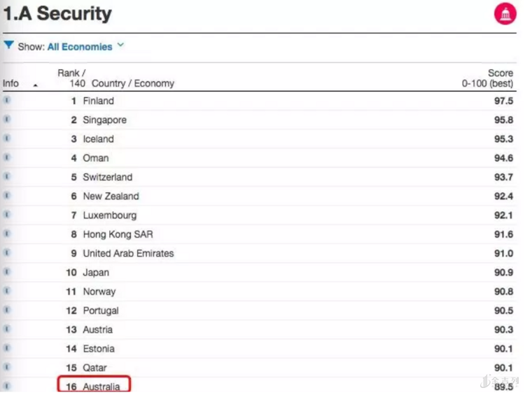 最近,一份《全球竞争力报告》中,总结出了世界安全性国家及地区的排名你们猜猜,澳洲排第几?