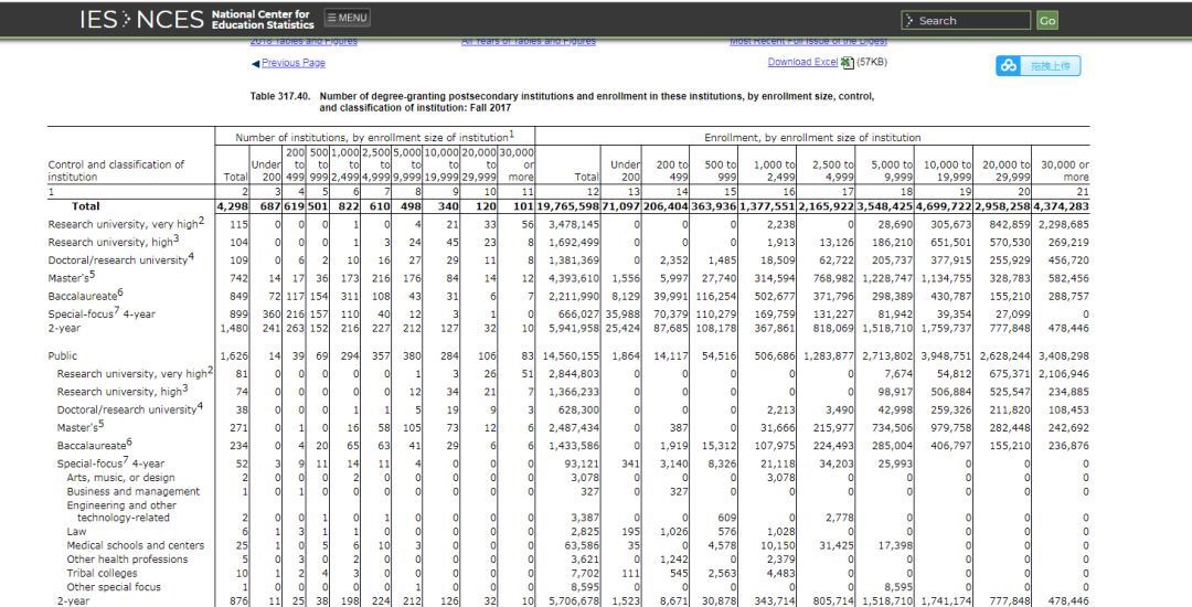 在NCES(国家教育数据中心)列出的4298所学校中,2017年秋季共有1626所公立大学、1687所私立非营利学校,和985所营利学校。数据将这些机构分为四年制大学和两年制学校,两年制学校通常称为社区大学。