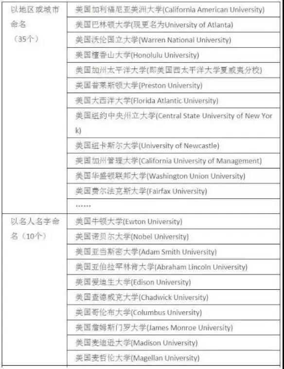 以美国为例,根据2016年披露的美国“野鸡大学”前100名的名单,其中以地区或者城市名命名的最多,共35个,其次是以“国际”为噱头的有16个,蹭名人热度的10个,另外还有以热门专业命名的6个,假冒名校或者假装和名校联合办学的4个。