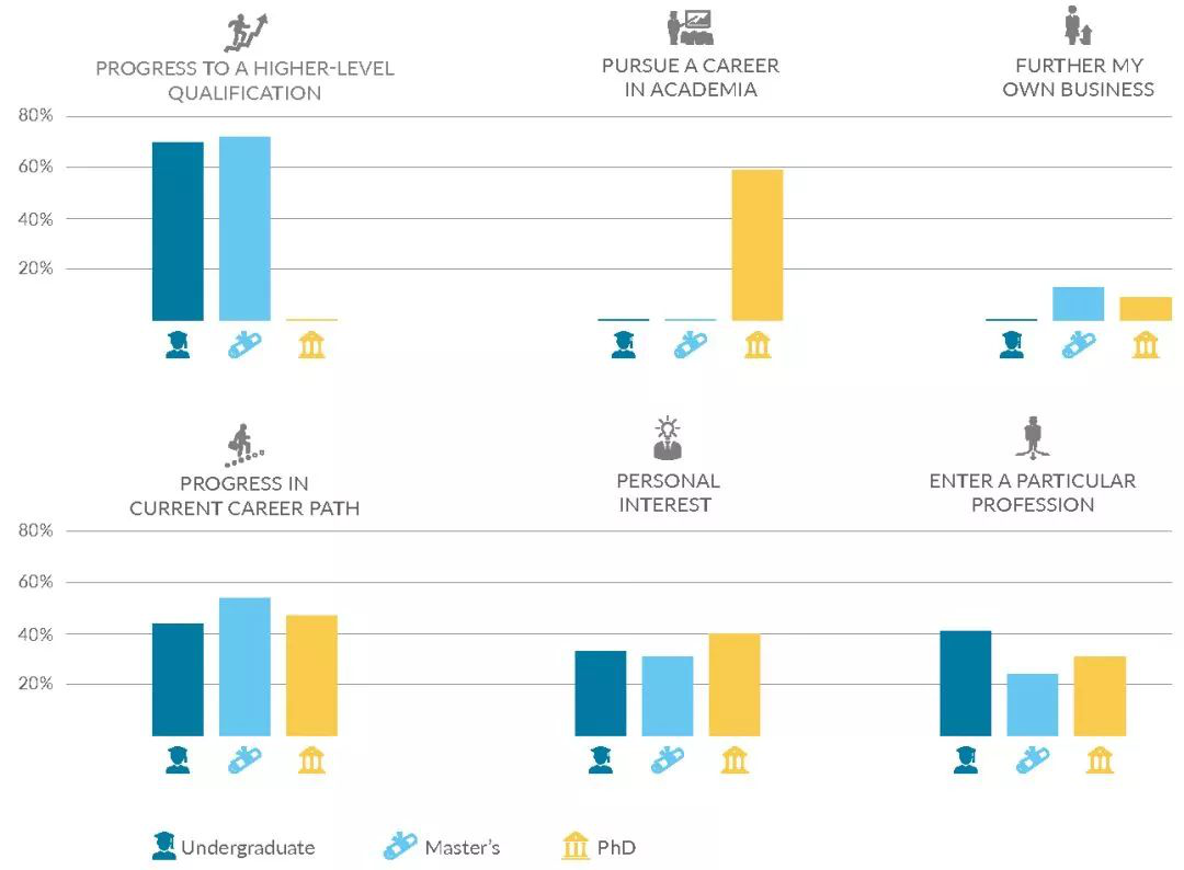 从图表中我们可以很明显的看出来, 本科和研究生阶段出国留学是追求文凭,博士阶段则是为了学术上的成就;其中东亚地区学生出国原因更多是职业( 43%),兴趣(41%)。