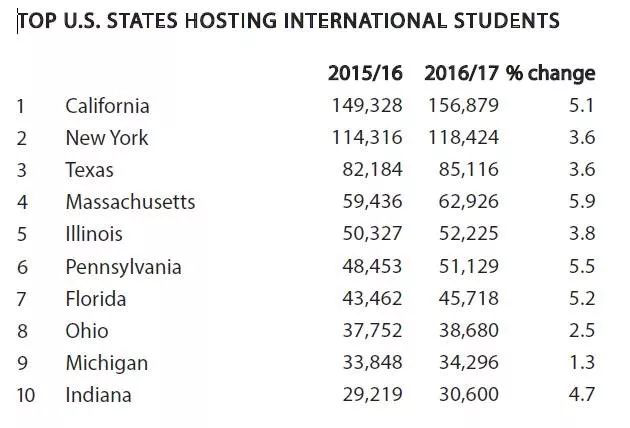 P.S.包括中国在内的亚洲地区,大家更偏爱去美国(40.6%),澳洲(32.3%),加拿大(31.9%),英国(31.3%),和德国(26.4%) ,不多说,至于为什么那么偏爱美国,你懂的 。 而细化到美国本土, 根据美国国际教育部发布的《国际教育交流开放门户报告》,在 2016-2017学年,美国最最热门的留学地区是加州和纽约,德州的留学生人数也在增长。