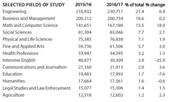 工程、商科和 CS是留学生最爱的三大支柱专业。有超过一半的留学生选择此类专业。人数增加最多的依然是火爆的CS专业,增幅高达18%。