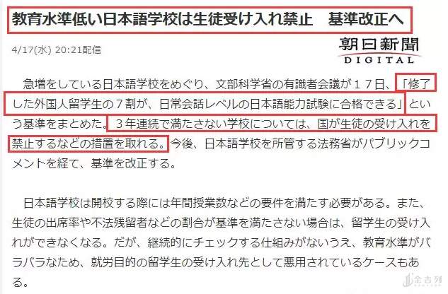 17日,在日本文部科学省的有识者会议上确定了一项关于日本语言学校的标准,规定在语言学校毕业的留学生, 必须有70%的人通过日本语能力考试 (日常会话水平)。 连续三年达不到标准的学校,将会被禁止招生。