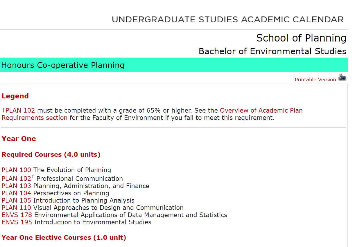 第一步,找到自己必修的课程清单。每个专业都有本专业的必修课,不修完这些课程的话是没有办法顺利毕业的,所以弄清楚自己都有哪些、有多少必修课程是重要的第一步。这些信息一般可以在学校官方网站上找到,以滑铁卢大学本科规划专业举例子(截图见下图):在学校给出的 Unergrauate Stuies Acaemic Calenar 中找到规划专业的页面,也即是 Honours Co-operative Planning 就可以看到第一年的必修的课程有八门,两门选修课程,这里就可以确定必修课程的课程名称编码。