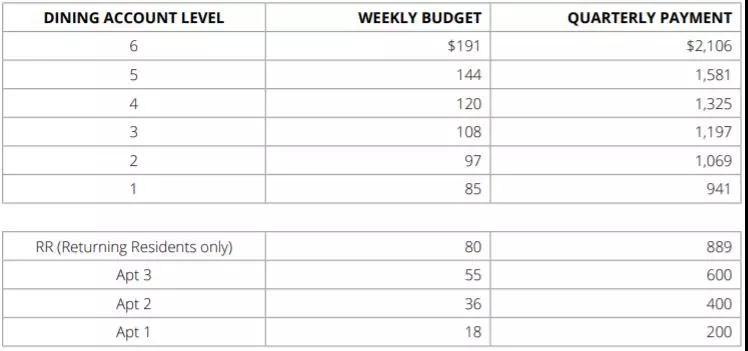 - 以下是不同标准的Dinning plan的价目表。注意,inning plan在任何时期都可以进行升级和再次充值,但不可以随意降级,所以请谨慎购买。