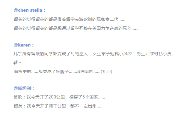 其实在美国留学党与英国留学党之间,也存在着一条看不见摸不着的“相互鄙视链“,且极端化相当严重。下面就让我们来看看你们的学长学姐们怎么“疯狂吐槽“的(以下皆是调侃专用,如有当真,纯属…)