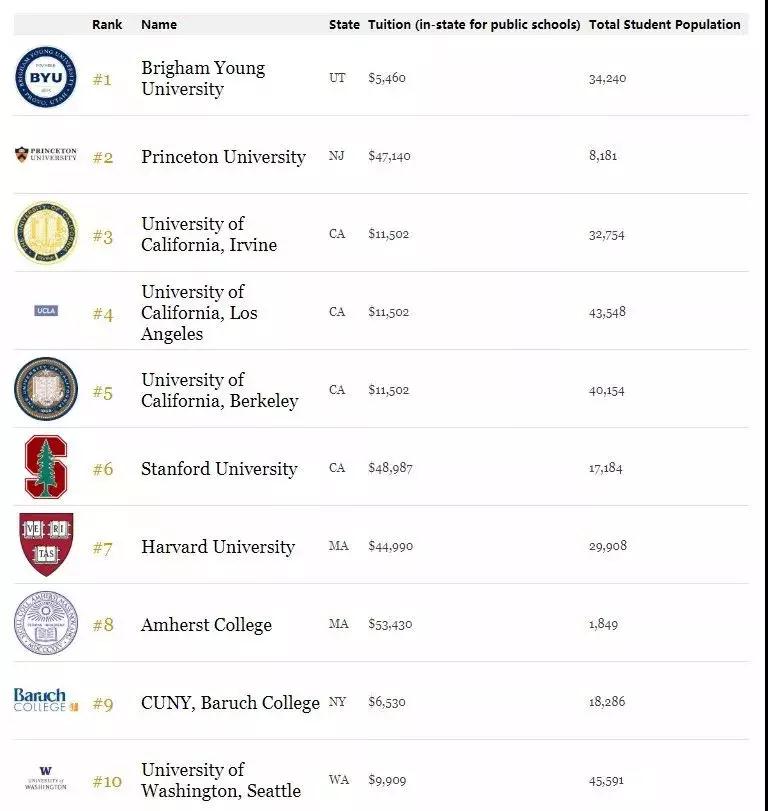 今年福布斯通过收集和比较美国50个州、645所高校的数据,经过综合评定后排出了这份“2019最具价值美国大学排名”。下图是 排名的前10名: