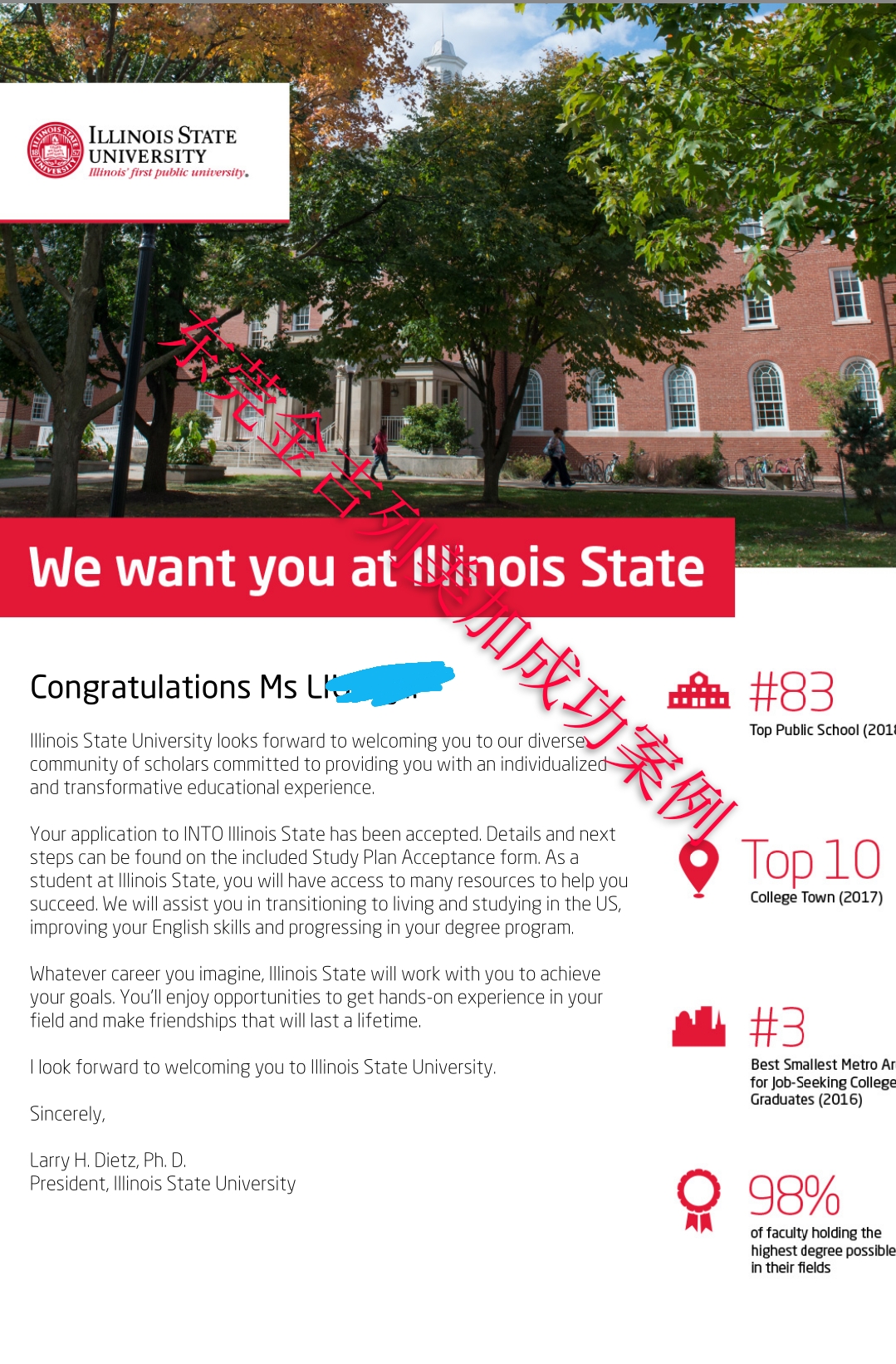 刘同学雅思5分,获得ISU伊利诺伊州立大学录取,桥梁3学期,一年可以读完大一学分课程。完全可以跟直入大一的学生一起毕业。