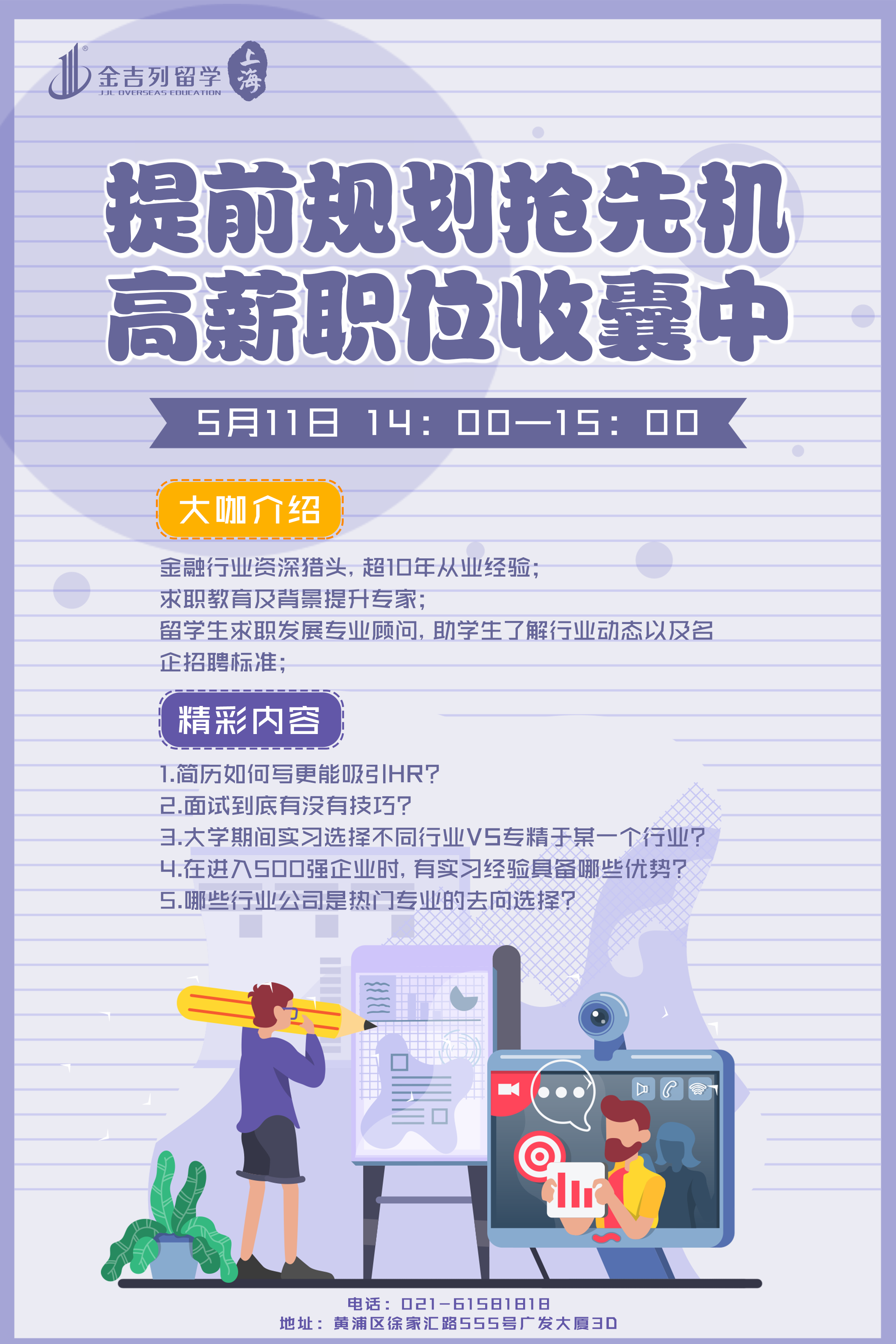 为了让同学们更好塑造个人形象,最高机率获得面试成功的机会,本周六下午邀请到资深HR,面对面为你分析。