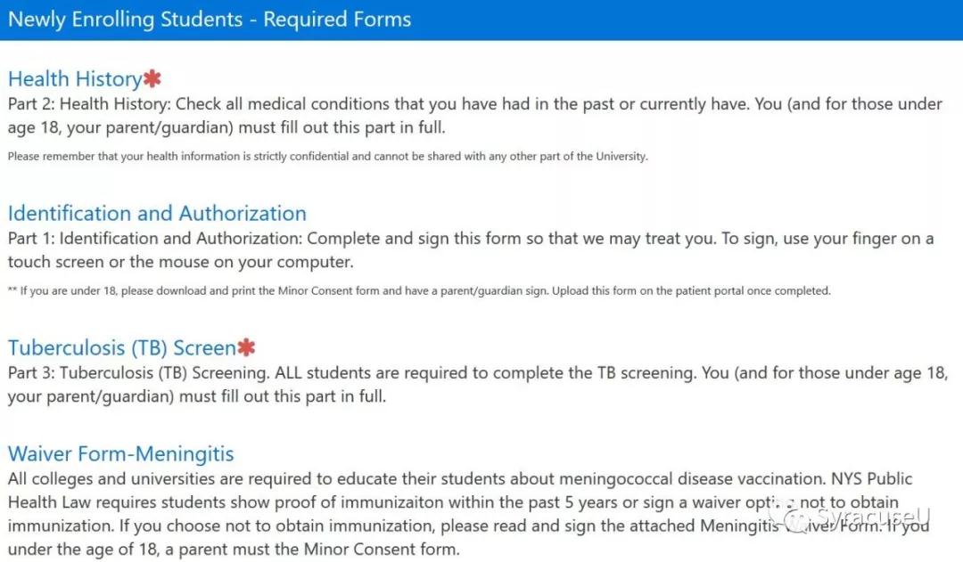 学生在校期间的健康和安全是学校和家长都共同关心的话题,所以在开学前,学校的校医务室会要求所有入学的学生网上填写疫苗记录和健康状况。 新生们要用自己的学生证号码和密码登记,也就是SU ID 及自设密码。 校医的网站是: health.syr.eu/resources/patient-portal.html