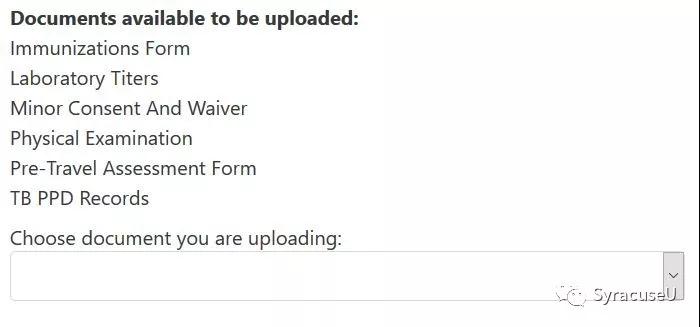 这里提醒大家 必需要 上传的是免疫证明:学校规定所有的国内及国际学生都必须要在入学前上传免疫证明,要打两针 MMR(麻腮风三联疫苗)和一针脑膜炎 ACWY 类疫苗(必须是在16岁之后,入学前的五年之内打的)。所有的疫苗记录 必须 在七月一号之前扫描上传,而且是中英文双语的。大家可以拿着自己的接种记录到国家指定的出入境疫苗中心去转换或者补打,这些中心为大家发放的就是所谓的小黄本记录,大家可以直接扫描,点击 Uploa, 上传到雪城大学校医务室的网站: