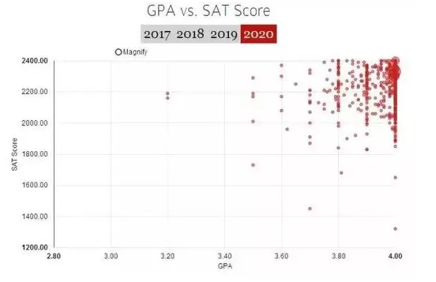 从下图可以看出,虽然有极个别童鞋GPA不到3.5,SAT不到1400,但大多数还是在GPA3.8,SAT2200以上,GPA4.0、SAT满分的区域更是密密麻麻一片红色。美国高校重视平时成绩(GPA),被录取的新生平时也是“学霸”,GPA集中在3.8﹣4之间。分数还是很重要的,特别是没有校友背景,没有任何突出奖项的童鞋,还是先把成绩提上去吧!