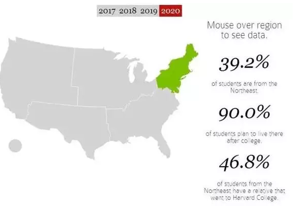 哈佛录取的新生39.2%来自美国东北部,这些东北部学生中有亲戚在哈佛的占到46.8%。美国本土以外被录取的学生占12.6%,其中15%有亲属是哈佛校友。