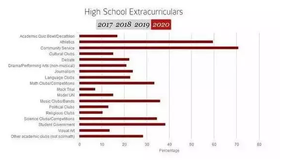 虽然整体录取率非常低,但是从数据分析可以看出来 50.8%的学生是EA被录取进来的,31.6%的学生是RA被哈佛录取,17.5%的学生EA被其他学校录取,但最终选择了哈佛。当然除了申请要早,标化成绩很重要之外,还有你的软性背景,也就是早规划。根据 统计数字表明,70.8%的学生从事了社区服务活动,59.5%参与了体育方面的各种课外活动,有过学生会经历的占到38.3%,音乐俱乐部或者玩乐队的占到36%,科学竞赛或俱乐部34.6%,数学竞赛或俱乐部33.5%,新闻记者方面活动占到23.9%,语言俱乐部22.8%,有辩论活动的占22.3%,戏剧表演21.1%,文化俱乐部15.1%,政治时事俱乐部13%,模联15.2%,学术全能竞赛17%,模拟法庭7.2%,其他非数学与科学的学术俱乐部经历的学生有28.4%。