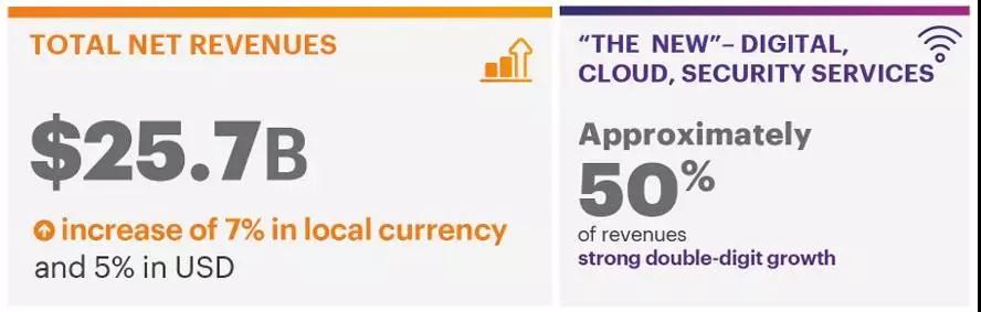 作为“世界500强”的常客,埃森哲始终“领新”,在数字服务、云服务和安全服务等创新领域业务(THE NEW)的收入已占到公司全部收入的半壁江山 。