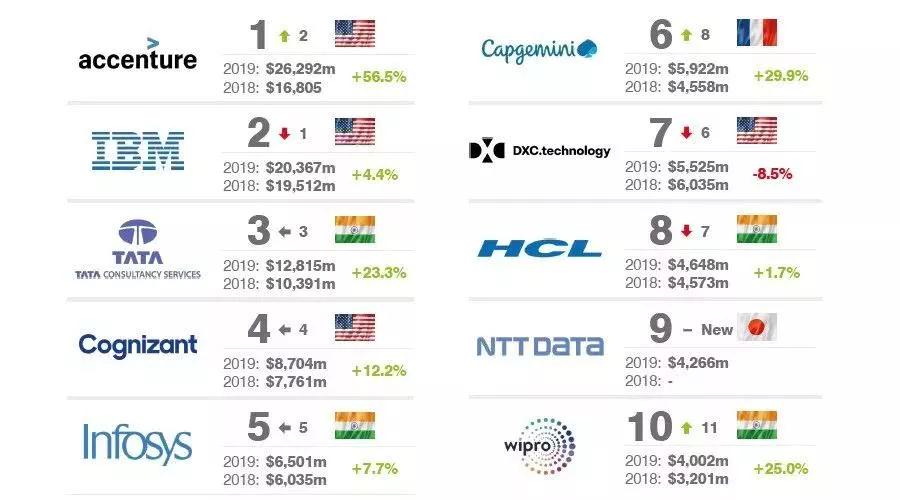 据英国品牌评估机构“品牌金融”(Bran Finance)发布“2019全球最有价值的15大IT服务品牌”排行榜(Bran Finance IT Services 15 2019), 本年度埃森哲超过IBM名列榜首,品牌价值263亿美元,比上年增长56.5%。
