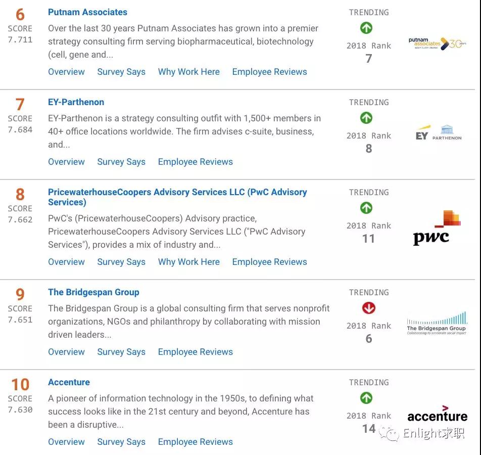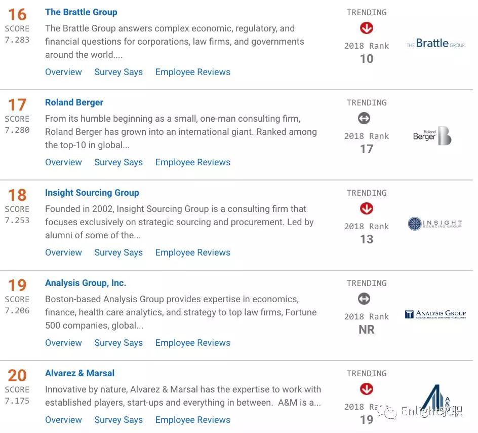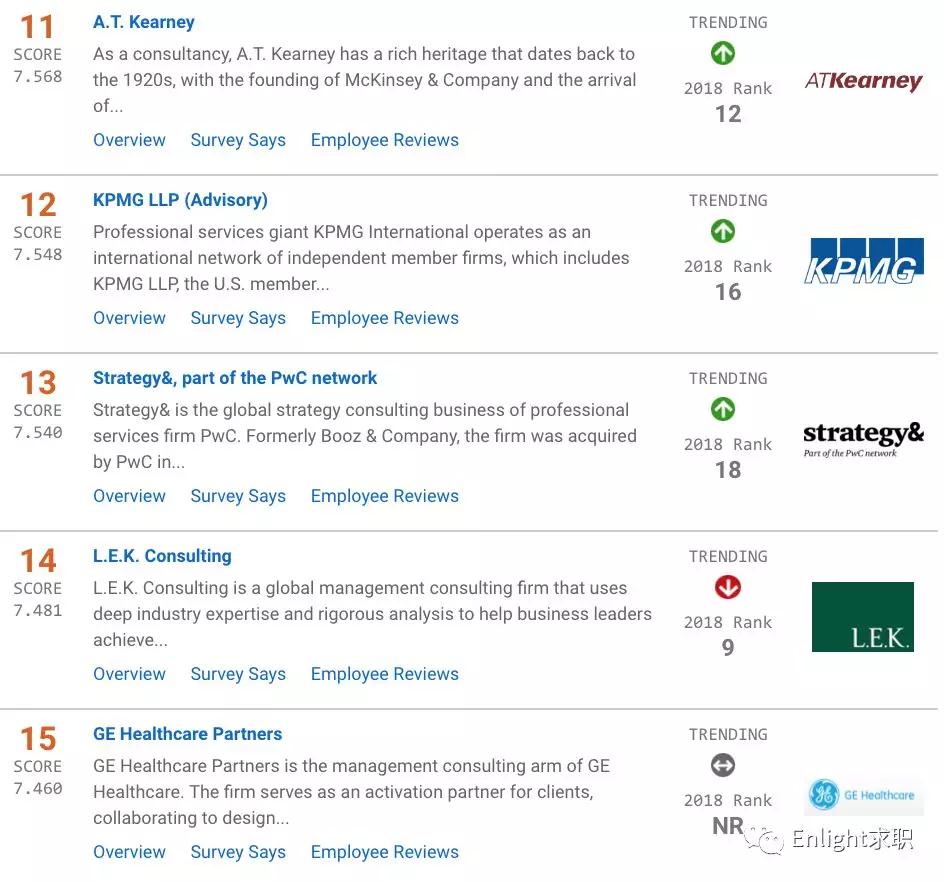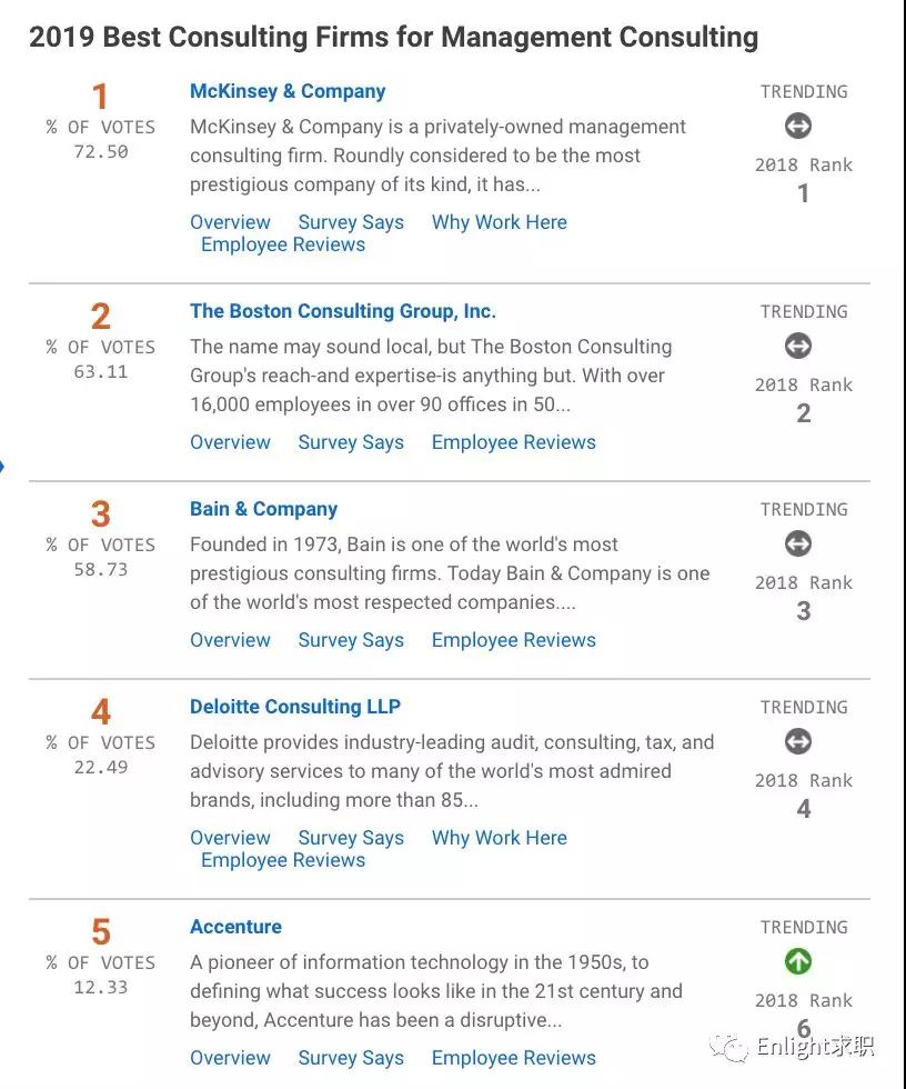 前几日,全球知名的职业发展机构Vault发布了2019年的全球咨询公司排名。 Vault基于对17000名咨询顾问的调查结果,从以下几个方面得出了这一份最新的咨询公司榜单: