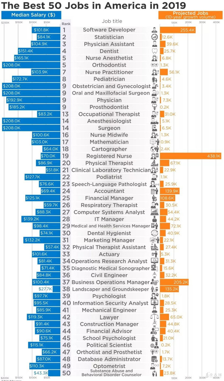 首先,该排名中所涉及的职业,来自美国劳工统计局(U.S. Bureau of Labor Statistics)确定的 2016年至2026年预计空缺数量最多的职业数据。