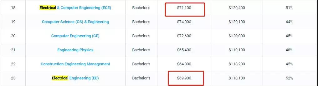 EE这个专业算起来还是十分赚钱的。根据美国薪酬网站payscale的统计,Electrical & Computer Engineering (ECE)电子和计算机工程专业 本科 毕业生平均起薪达到了71,300美元,而 中期薪资达到了122,300美元 ;而 Electrical Engineering (EE) 电子电气工程专业 本科毕业生平均起薪达到了69,900美元 ,而中心起薪也达到了118,100美元,真的可以算是很多了。