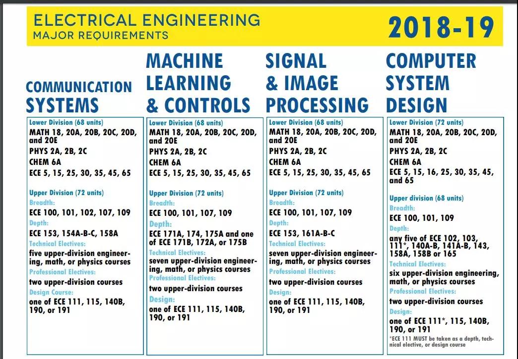 金吉列赵老师为大家摘录了UCSD的EE专业要求,大家可以看看: 刚进入大学的时候,学校有电子 电子 工程的基础课,其中包含通信系统、电子电路和 系统、电子设备和材料、机器学习和控制、光子学和 信号和图像深度处理。 在另一个细分领域里,你也可以学习计算机系统的深度设计。