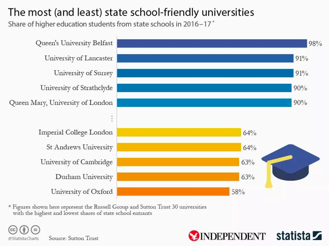 喜欢私立名校学生的英国大学不仅是牛津和剑桥。 杜伦大学、圣安德鲁斯大学、帝国理工学院 的私立学校学生比例也很高。