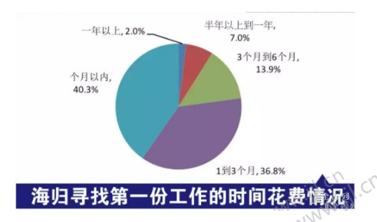 这张图出自智联招聘,是智联招聘海外部对留学生人群做的一项调查中的一部分数据,从图中可以看出,觉大部分海归能在1-3个月之内找到工作,少部分人花3-6个月也能找到工作,花半年及一年以上找到工作的人只占了留学生人群的一层。所以不难看出,整个留学生人群在国内的就业情况是乐观的。