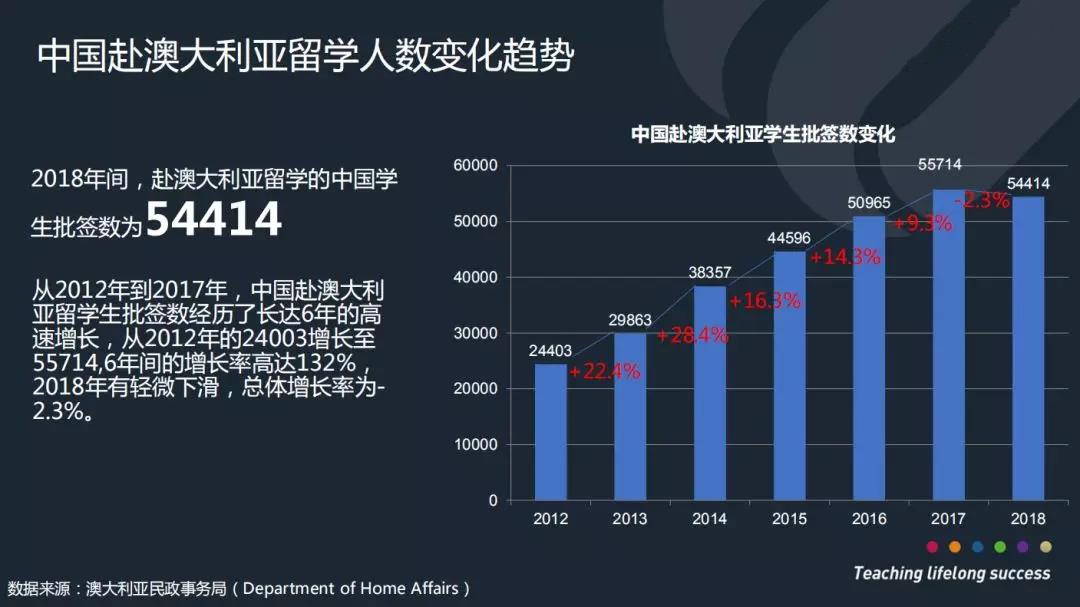 中国赴澳大利亚留学人数变化也总体呈现上涨趋势。根据澳大利亚民政事务局的数据,2018年间,赴澳大利亚留学的中国学生批签数达到了54414。