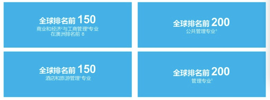 2016年泰晤士报大学排名制最国际化大学全球200强 2015年澳大利亚高校科研实力排名全澳前八 2014年QS全球建校五十年以下大学排行榜全澳第一,全球前二十 商学院获权威的AACSB认证