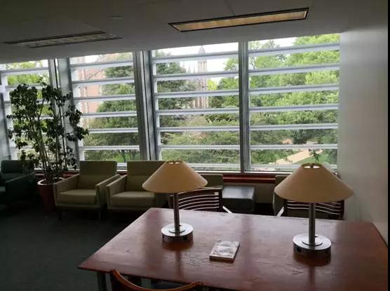 我比较喜欢一楼的座位,一楼被落地窗包围着,只要抬头就能看看窗外的景色,有时还能偶遇在树上跳窜的小松鼠。累了就坐到窗边的沙发上,闭目养神一会。但是一楼不是区域,会有同学小声低语,这种程度的环境音我能接受。