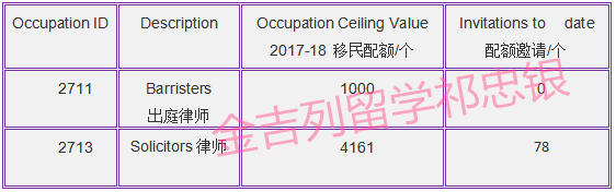 其次,从移民的角度 ,根据澳洲移民局最新一次 Invitations ,也就是在 2018 年 3 月 21 公布的澳洲独立技术移民 189 的 Occupation Ceiling Value 移民配额和 Invitations 配额邀请情况,澳洲律师相关职业的配额和邀请情况如下 :