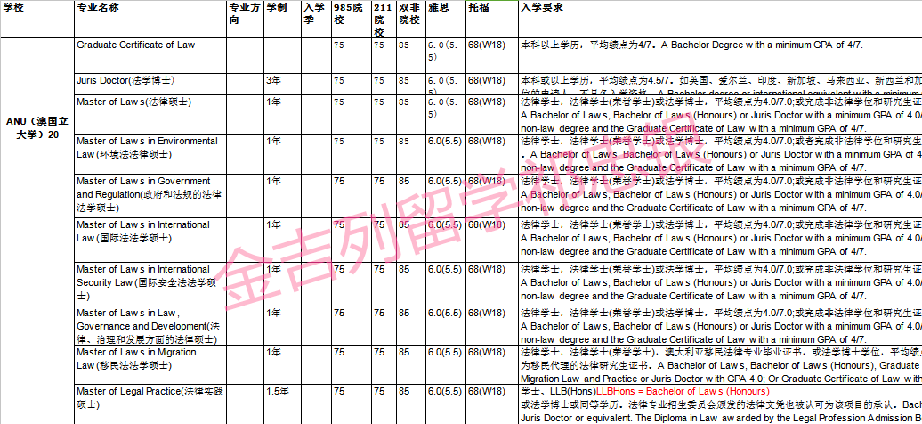 1 以2018年QS世界大学排名第20位的澳国立大学的法律相关硕士专业为例: