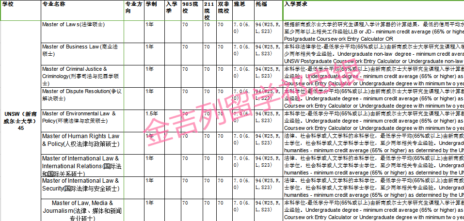 2 以2018年QS世界大学排名第45位的新南威尔士大学的法律相关硕士专业为例: