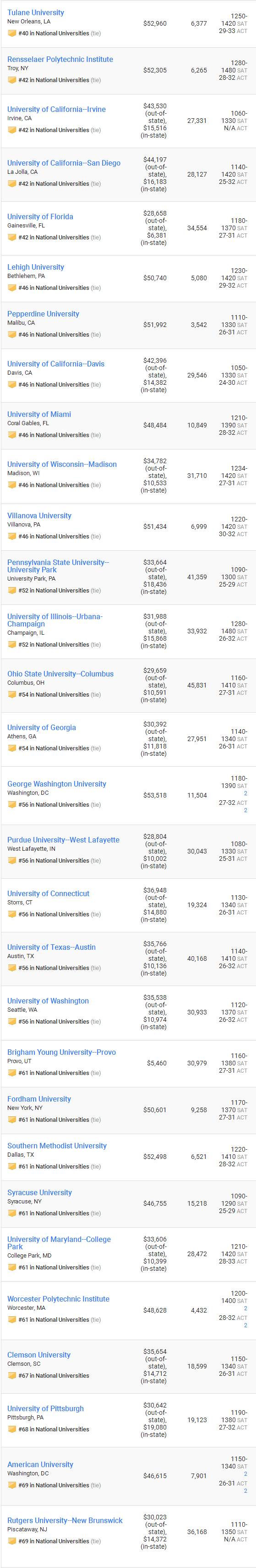 > 2018年美国大学排名录取均分(40-69)